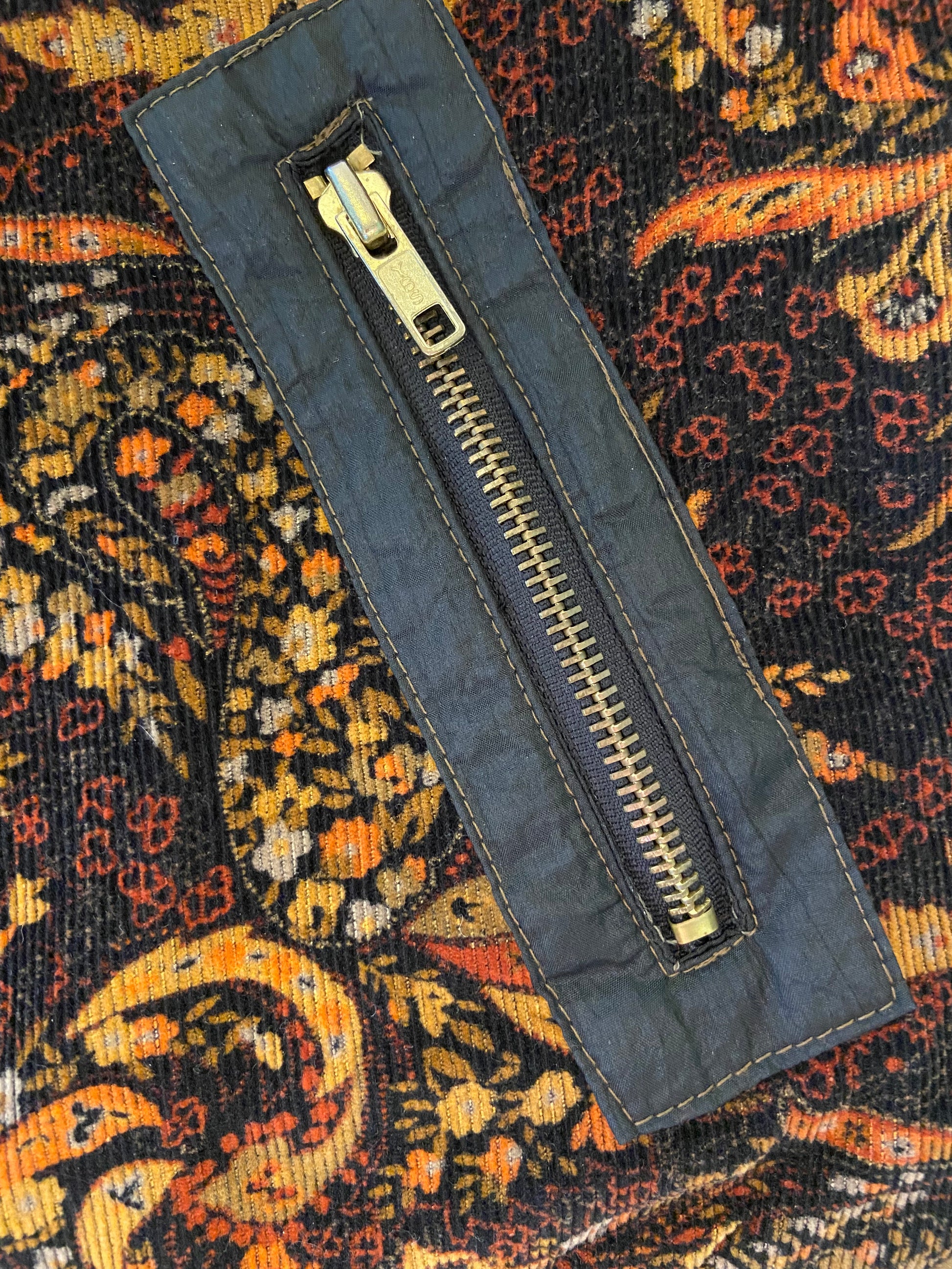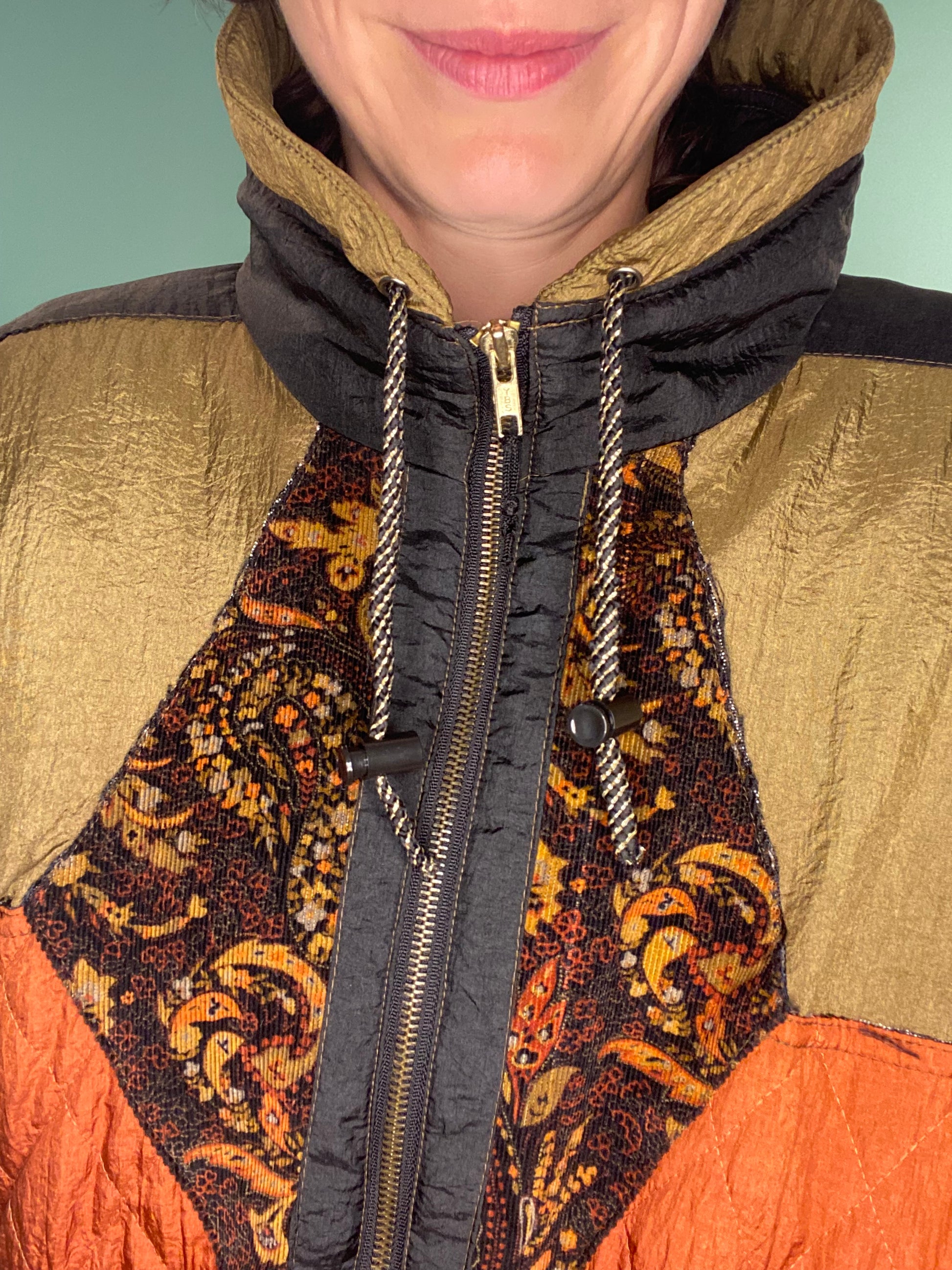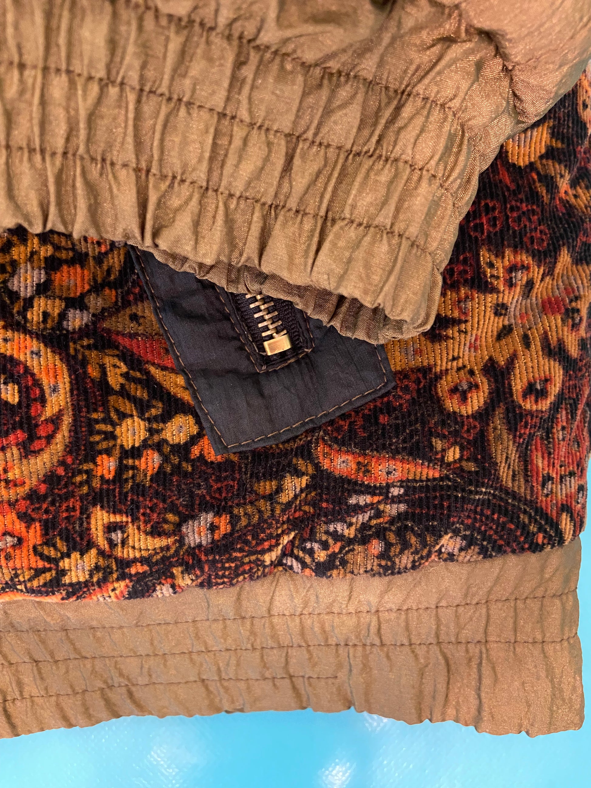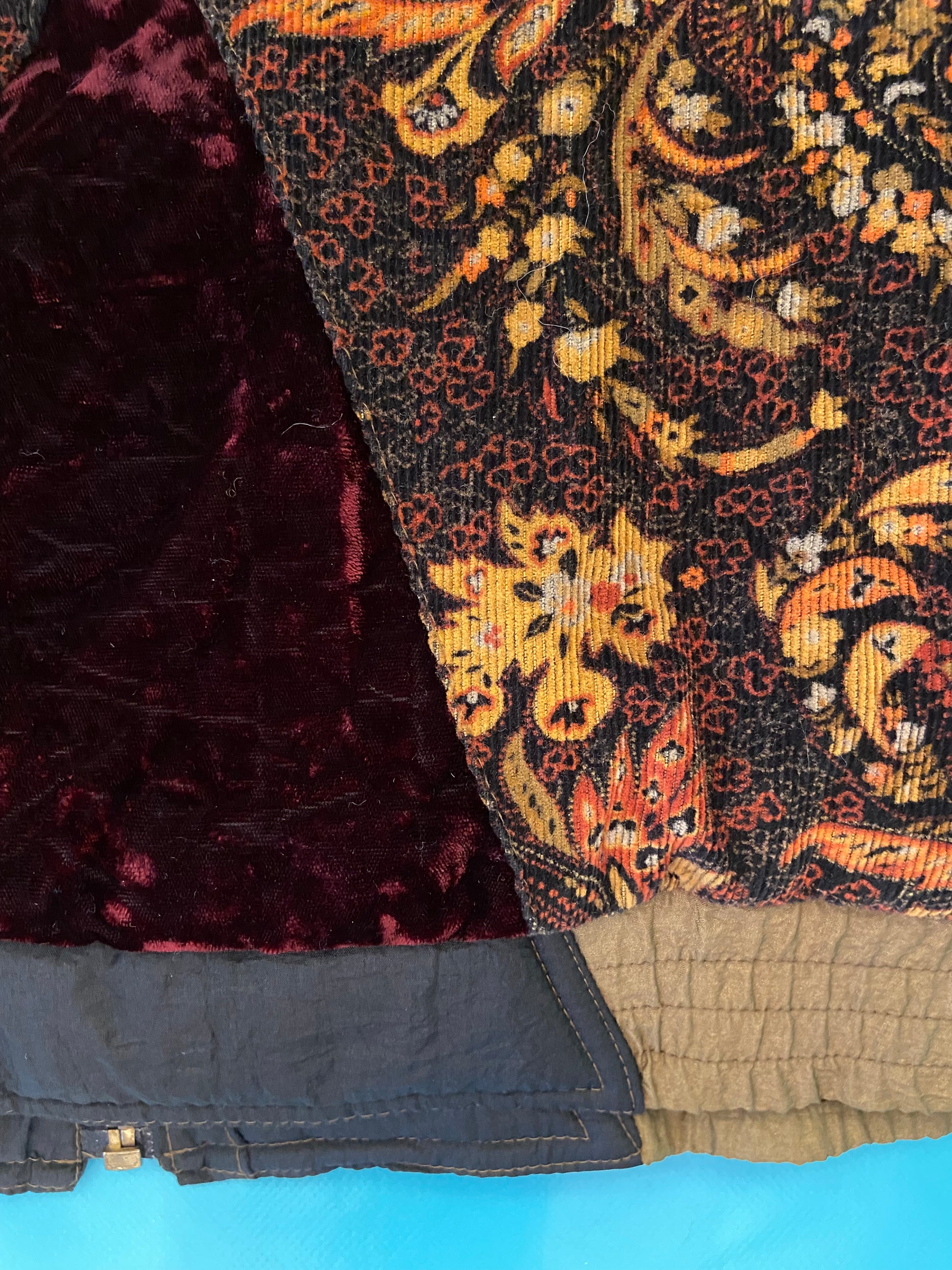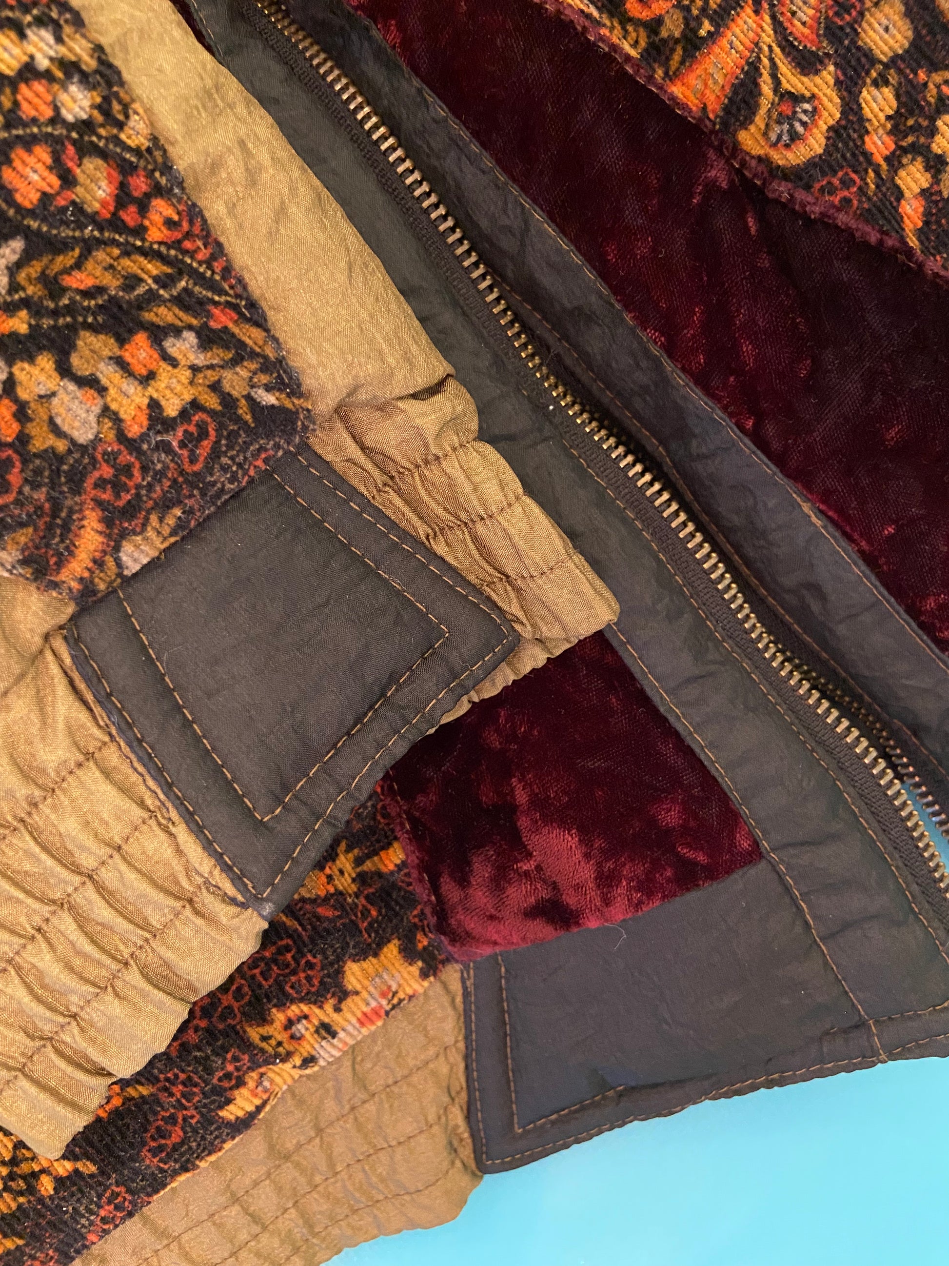 PAISLEY CORDUROY, WINE COLOURED VELVET AND SHINY WINDBREAKER FABRIC? WHAT A PARTY THIS COAT IS. ZIP POCKETS, ELASTICIZED WAISTBAND AND DRAWSTRING AT NECK