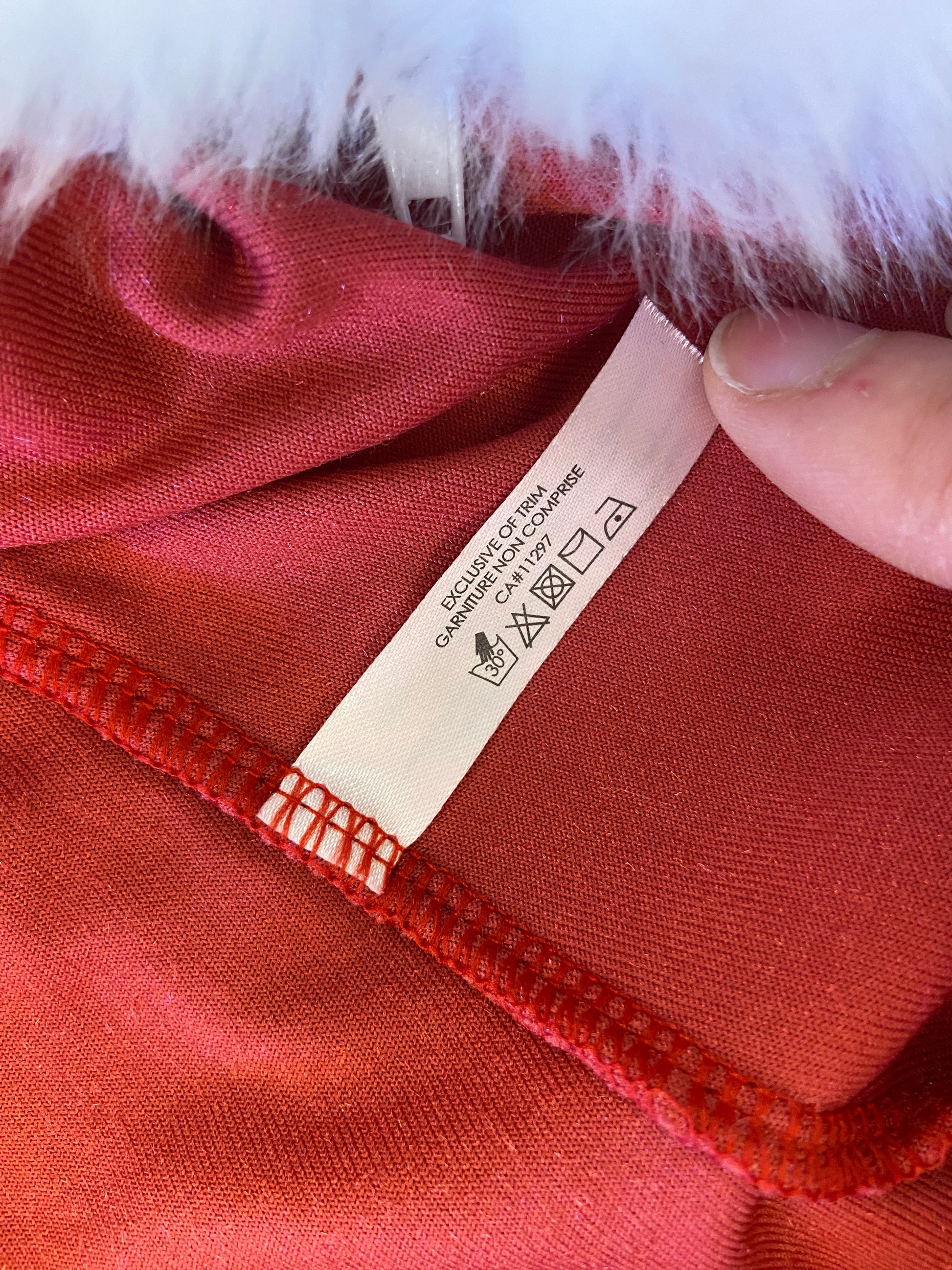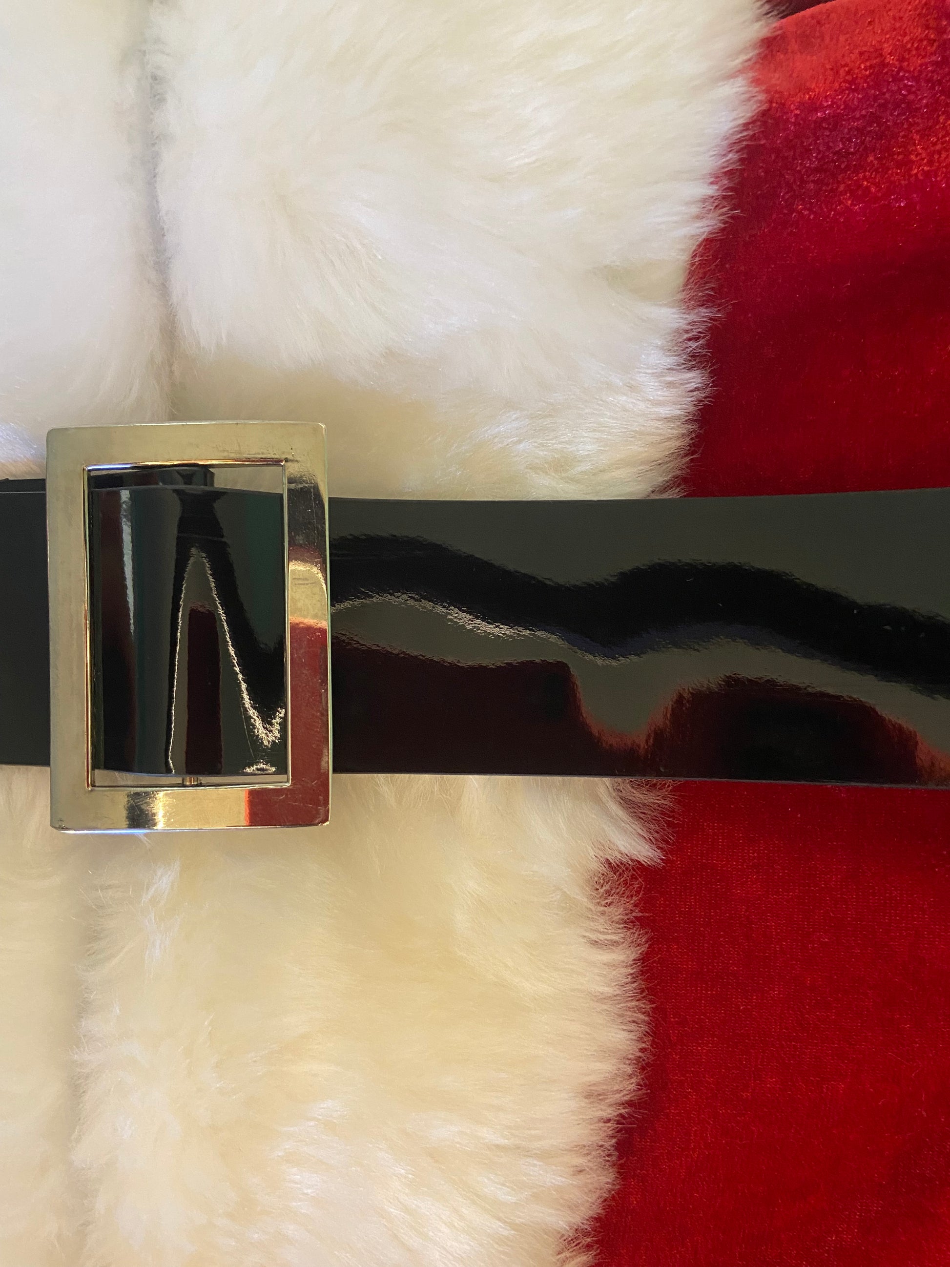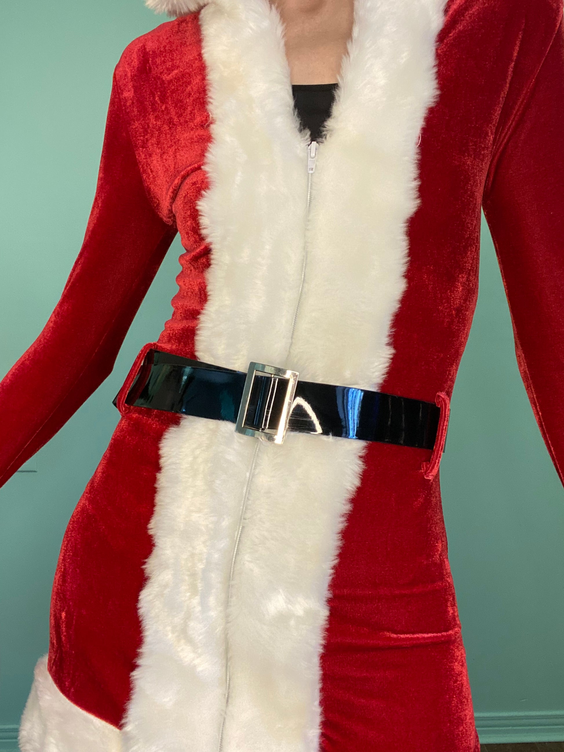 HOODED LONG SLEEVE "SEXY" SANTA DRESS. PATENT LEATHER BELT AND ZIPPER FRONT. SO FUN
