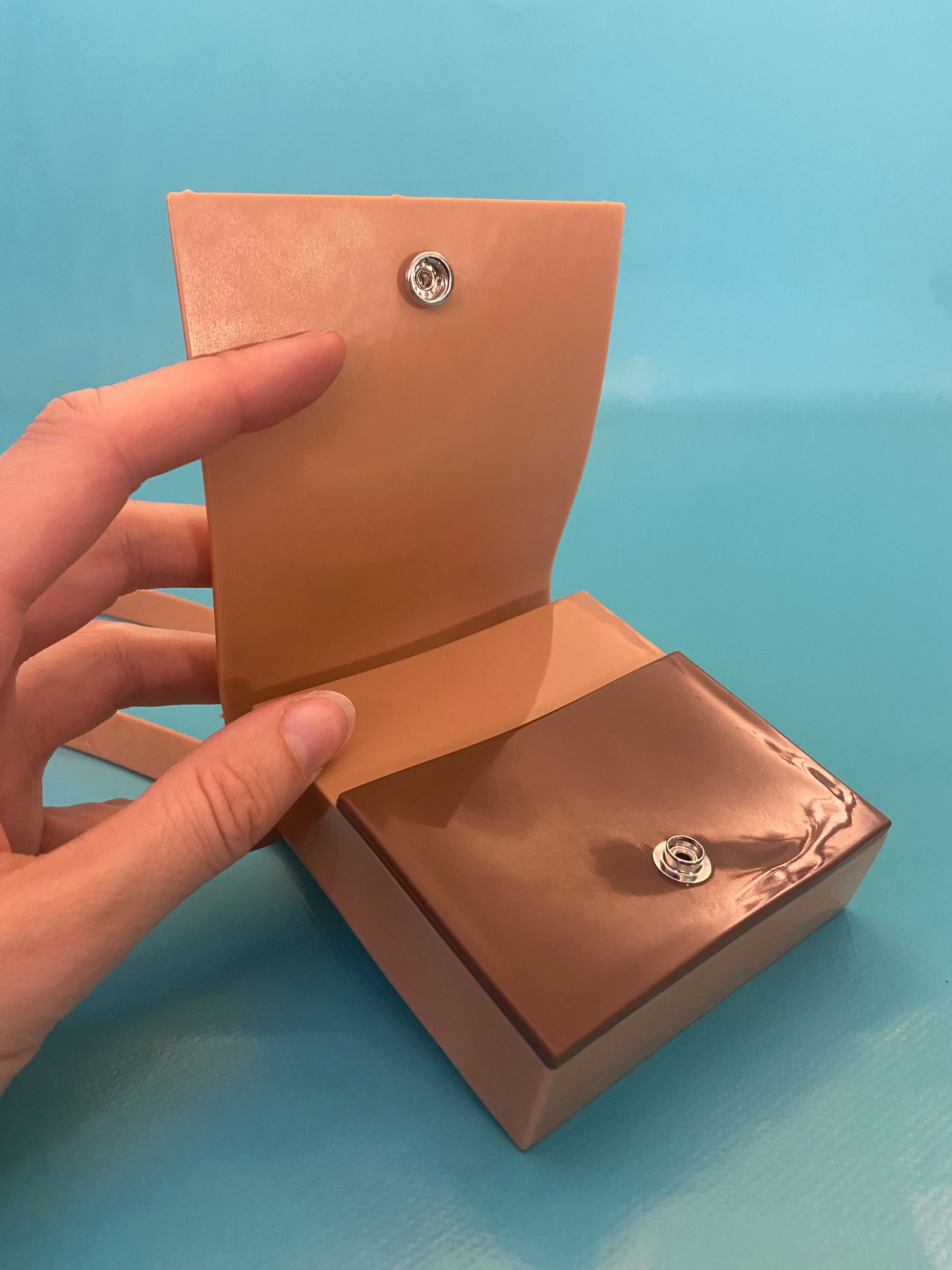 SNAP CLOSURE AND A LITTLE INTERIOR POCKET FOR CARDS ETC.
