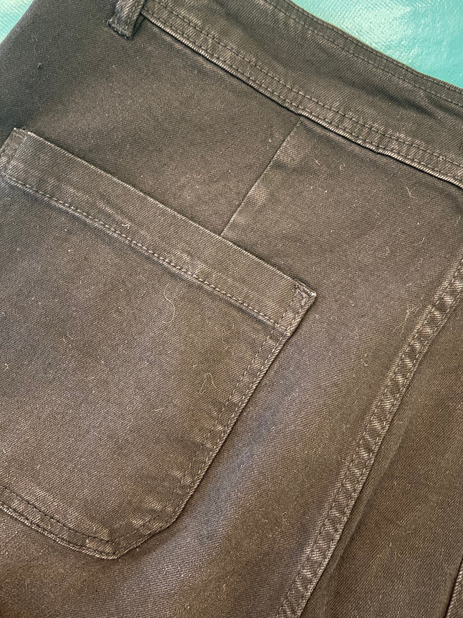 LOVELY STRETCHY BLACK DENIM WITH SQUARE POCKETS ON THE FRONT AND BACK. RAW HEMS AT ANKLE, AND ZIPPER FLY