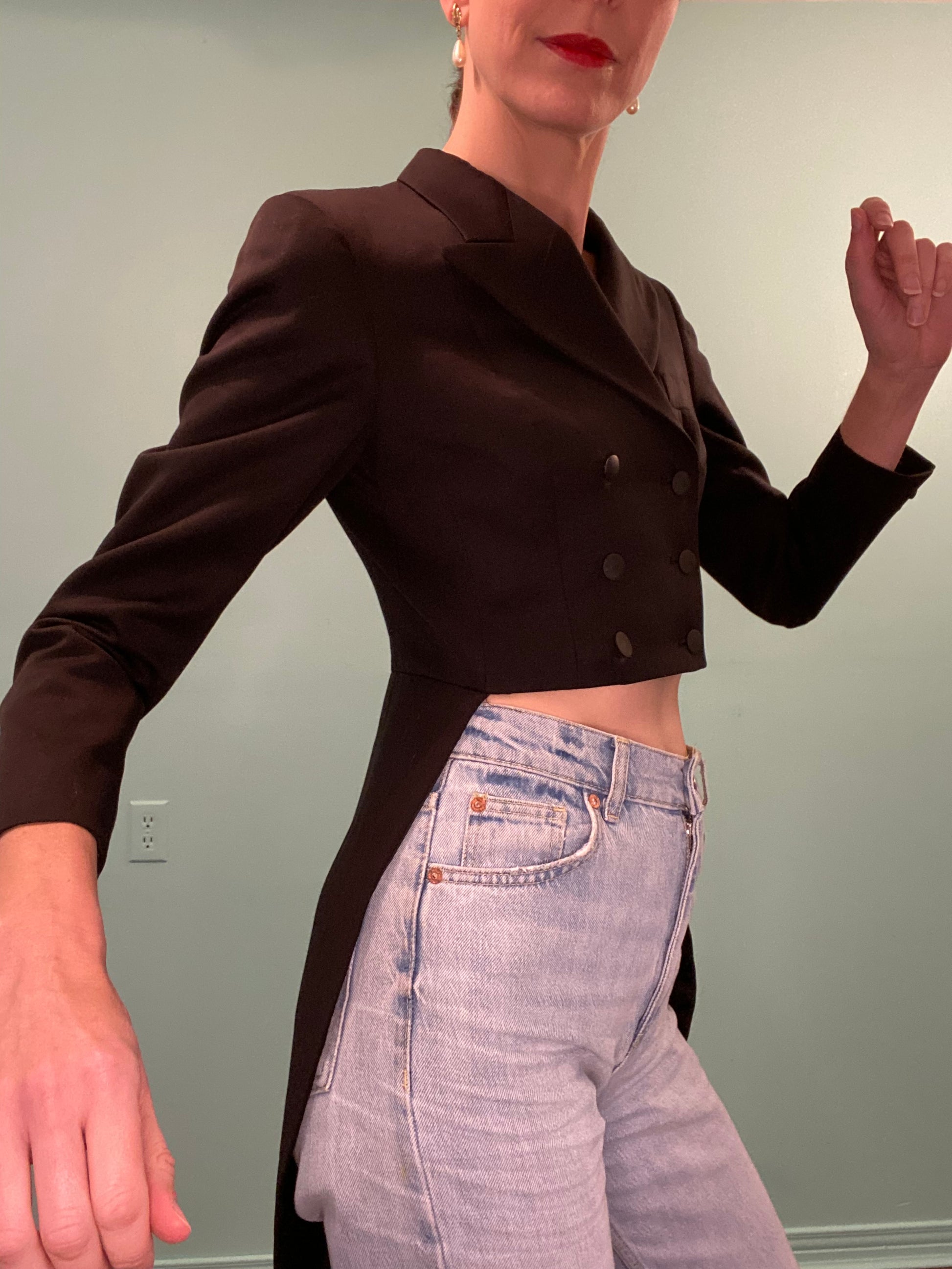 IF YOUR MODE OF TRANSPORTATION TO THE OFFICE IS OF THE EQUINE VARIETY LOOK NO FURTHER. THIS 100% WOOL SHADBELLY COAT IS THE PERFECT FORMAL ATTIRE.