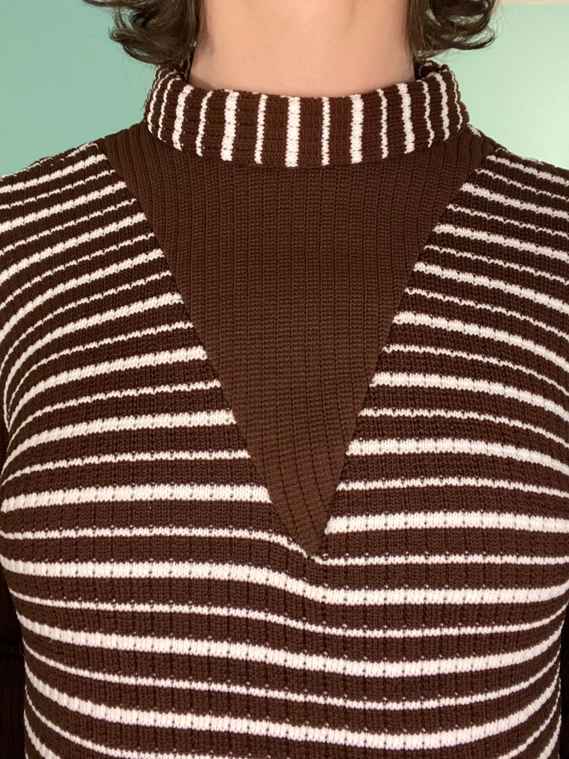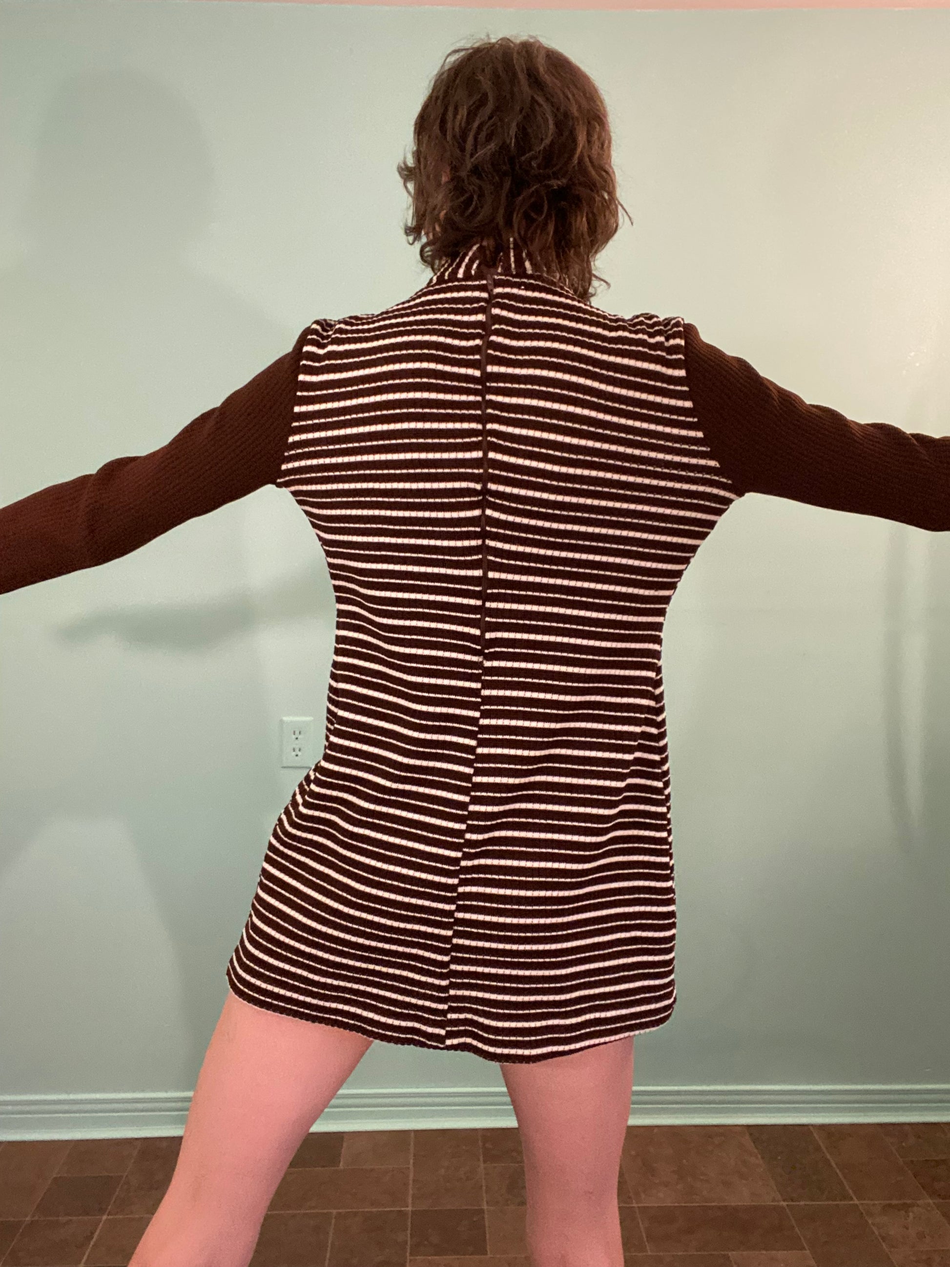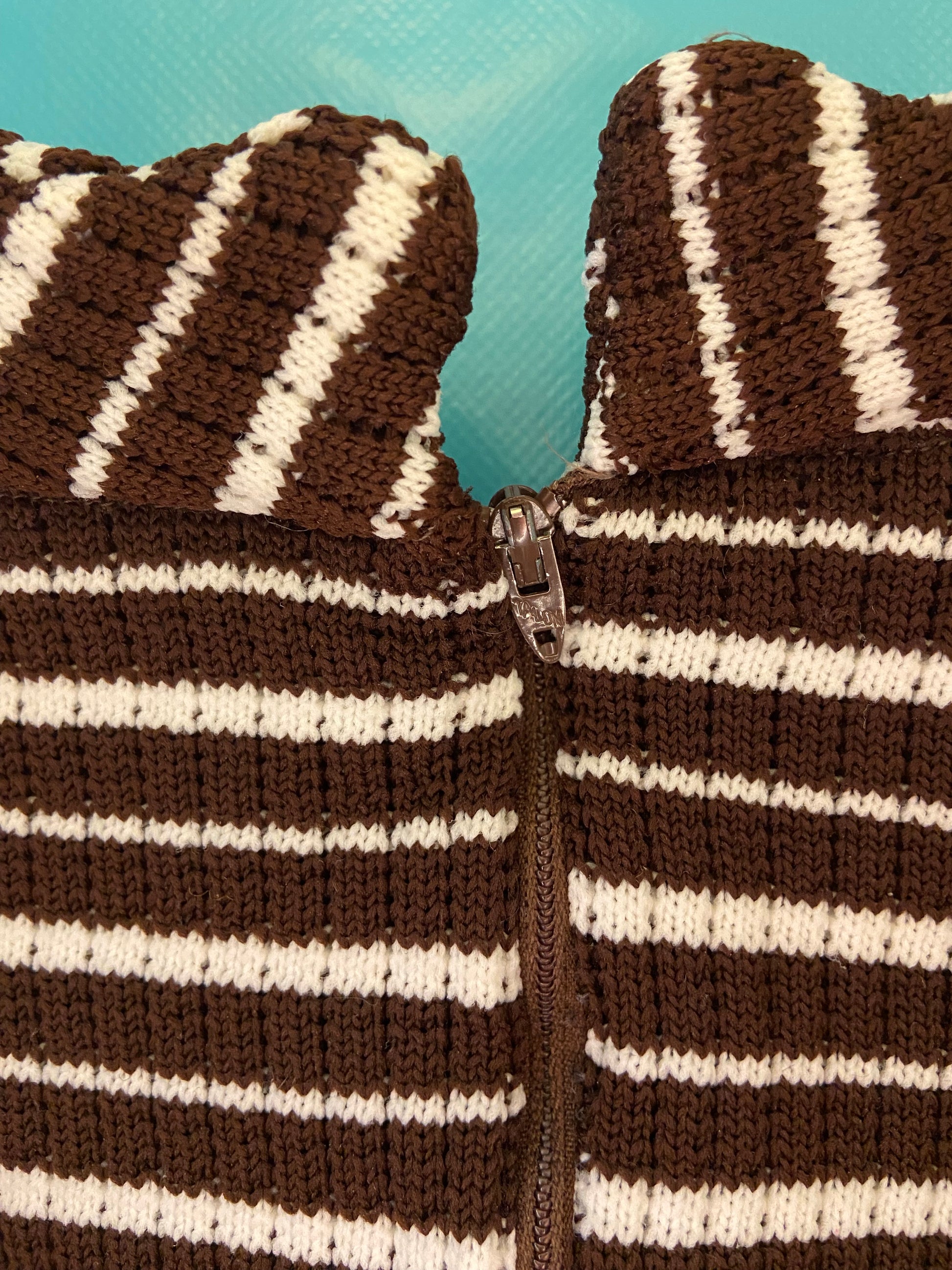 A PARTRIDGE FAMILY CLASSIC! BROWN BASE WITH WHITE STRIPES. V-NECK DETAIL AND ZIPPER UP THE BACK