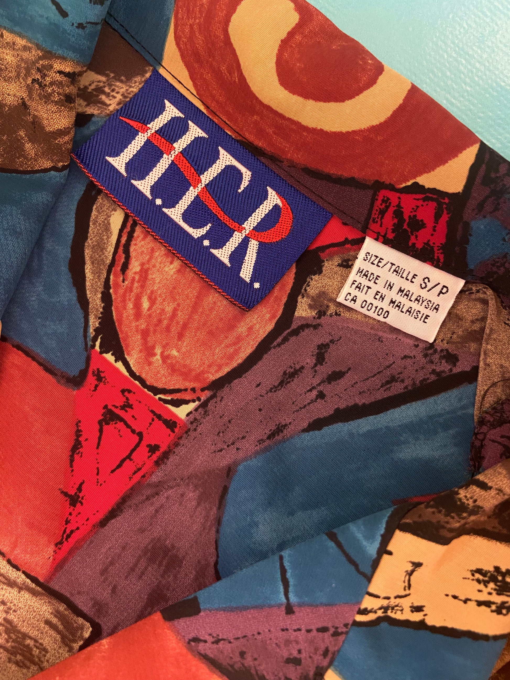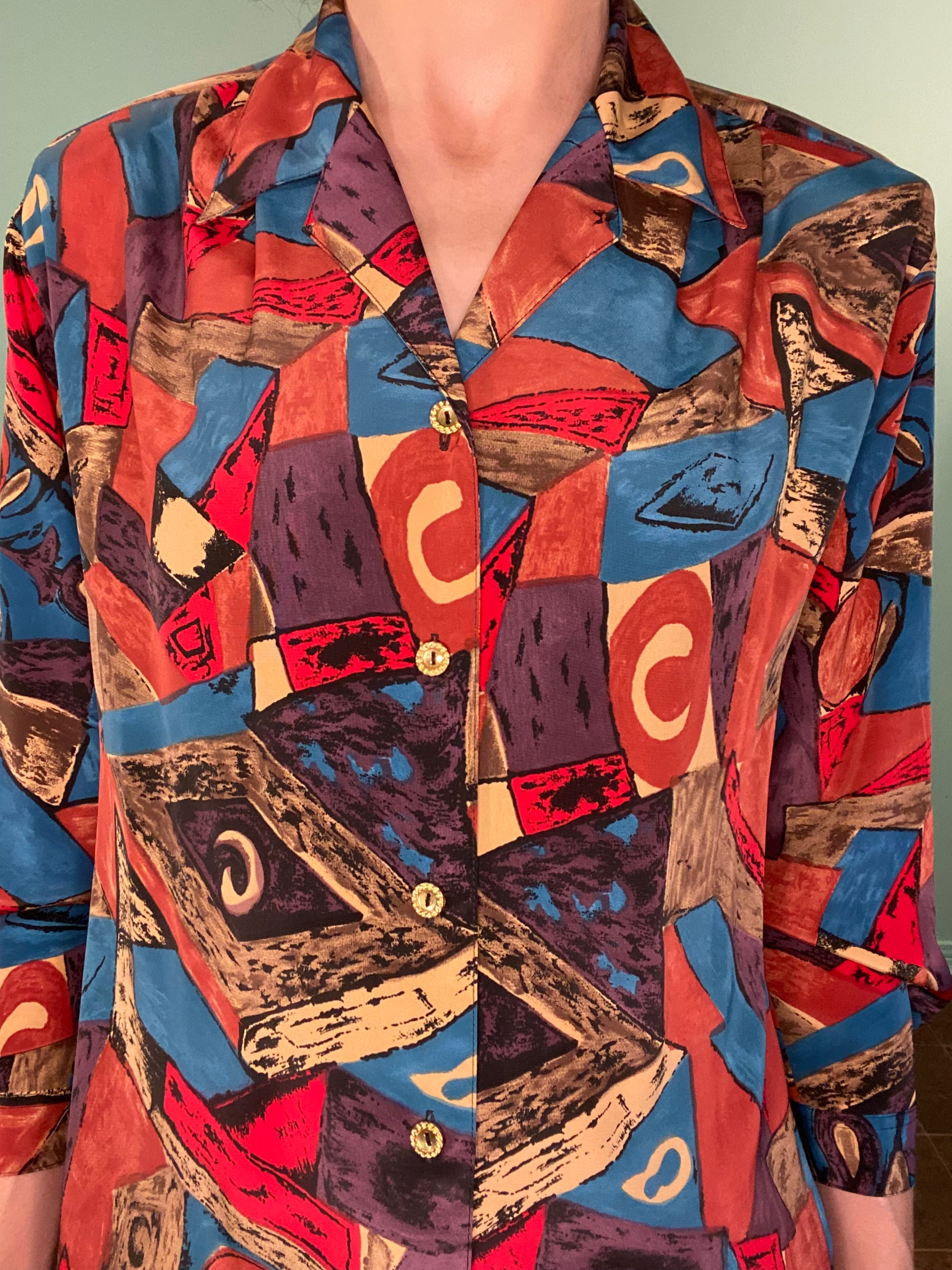 CLASSIC 90'S COLOUR SCEME, FUN PATTERN AND GOLD BUTTONS AND SHOULDER PADS.