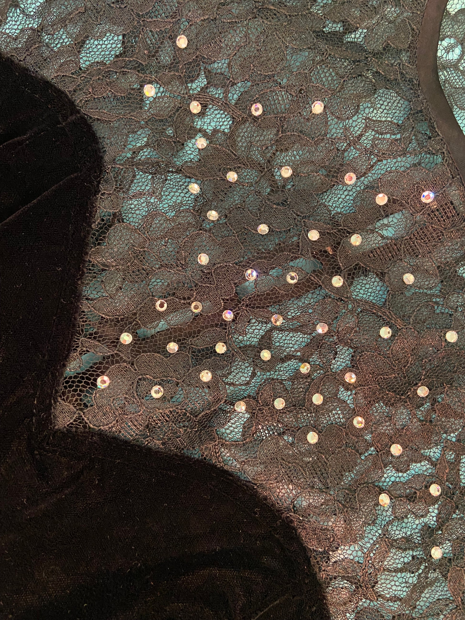 FUN LITTLE VAMPY NUMBER. VELVET SWEETHEART WITH POOFY (SHOULDER PADS) LACE SLEEVES AND RHINESTONES TO BOOT!