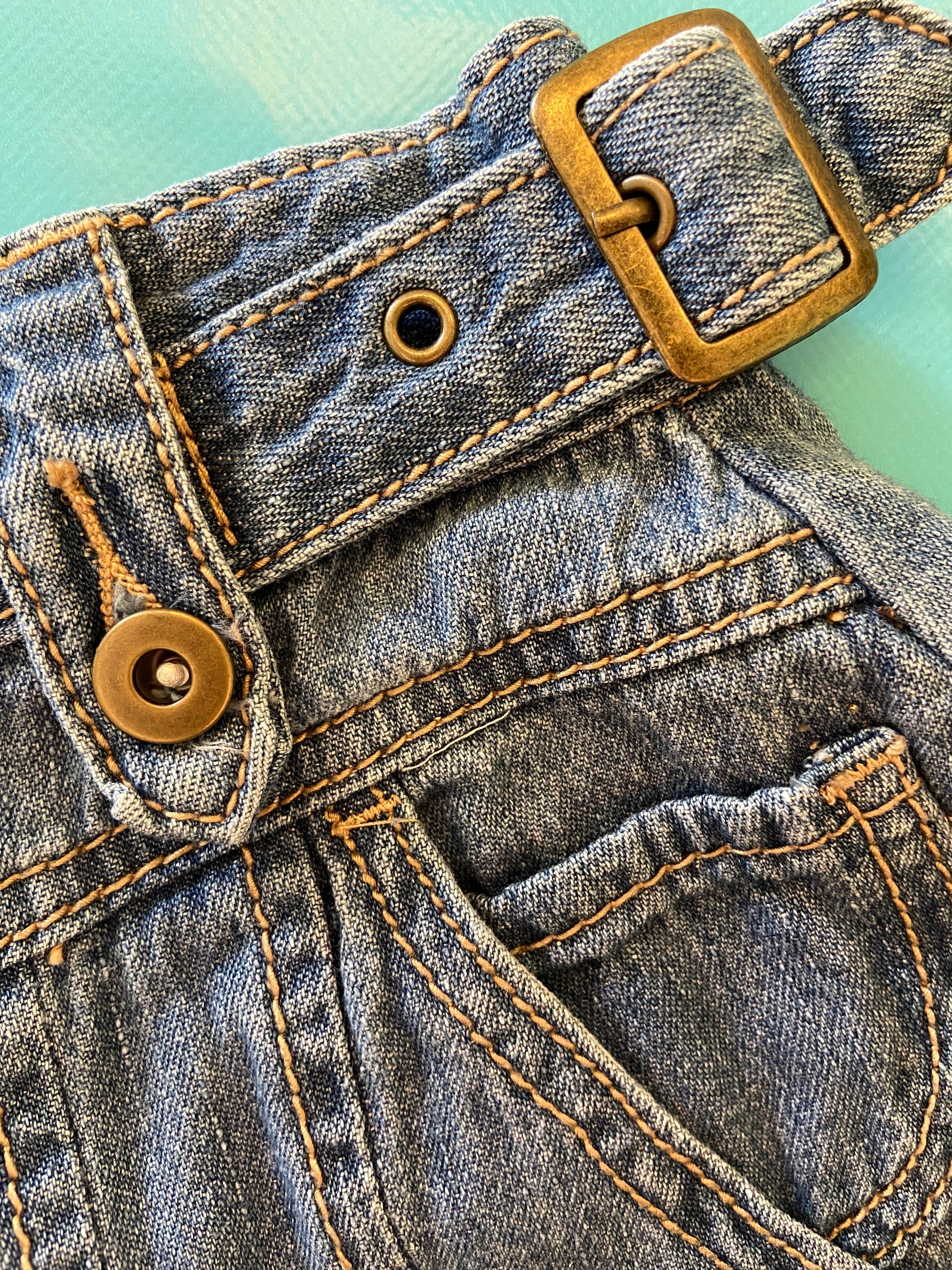 FUN KNEE LENGTH DENIM SKIRT. PLEATING DETAIL AT THE FRONT, CARGO POCKETS AND ELASTICIZED WAISTBAND AT THE BACK WITH BELT LOOPS AND BUCKLE DETAILS AT THE WAIST